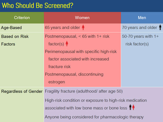 The next few slides will help you to understand who should be screened for osteoporosis and how people are tested.